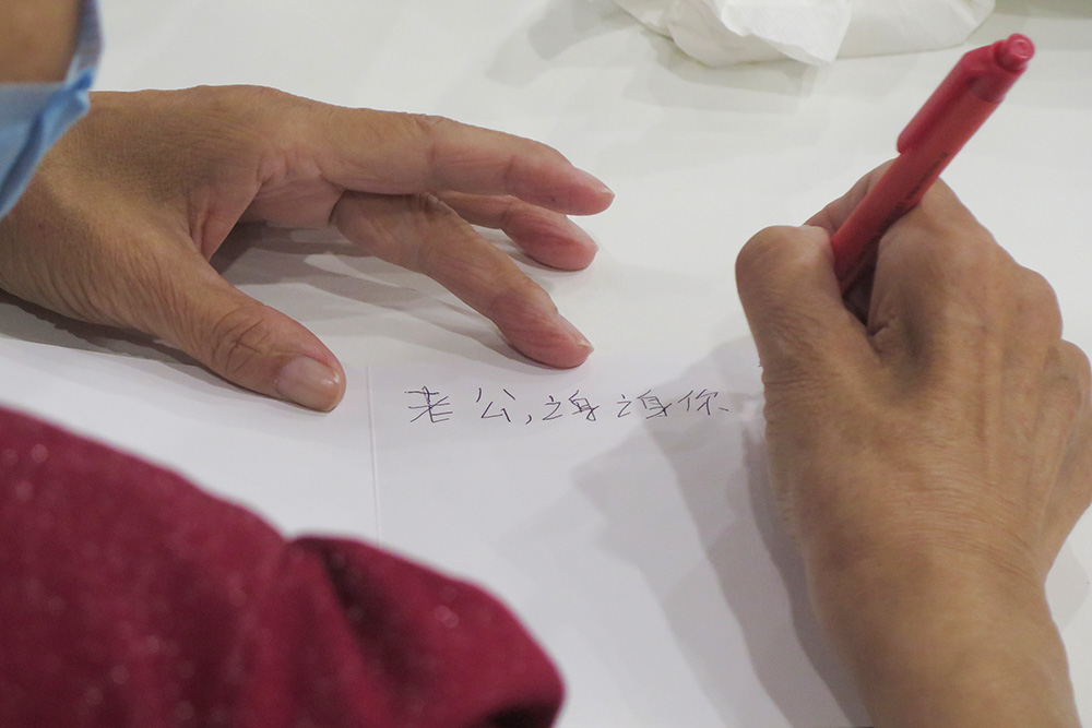Ms Sin Mei Leng, who is not highly educated, writes "Thank you, hubby" on a piece of paper, followed by a few simple words to her husband. He has been encouraging and accompanying her for 42 years. (Photo by Chew Zheng Yang)