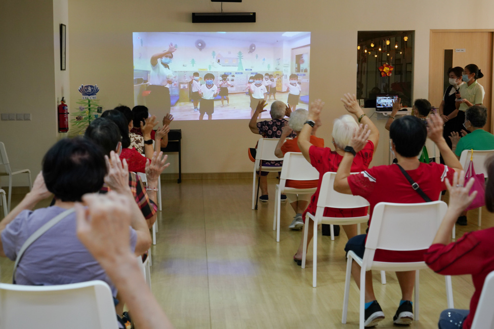 Seniors cheering along to the online performance of students from Tzu Chi Great Love Preschool. (Photo by Chan May Ching)