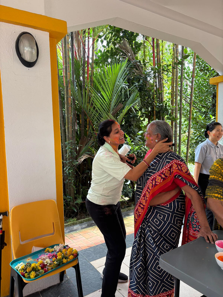 The event at SEEN @ Bukit Batok was a toned-down rendition that still preserved the spirit of the festival. "For the game, each team comprised two partners, and the one facing the audience had to guess the colour his partner was holding up. If he got it wrong, they would have to smear the coloured powder on each other's hand. The seniors loved the game.”