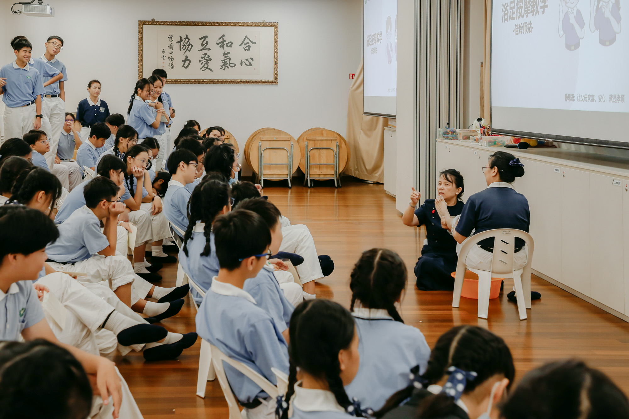 Lee Chia-Ling, a teacher of Tzu Chi Continuing Education Centre explaining the significance of foot bathing to the Tzu Shaos and demonstrating the techniques. (Photo by Fong Kwai Kin)
