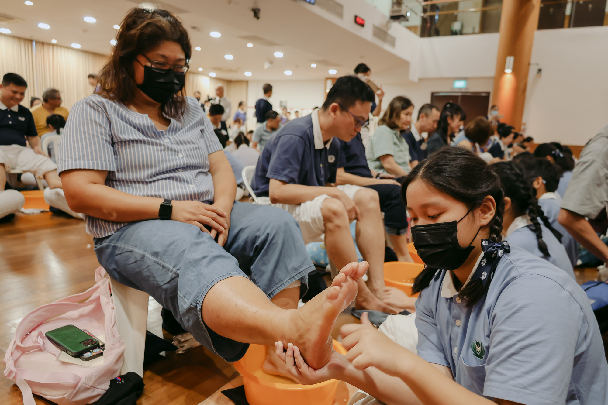 The Tzu Shaos knelt and gently massaged their parents' feet, expressing gratitude in silent reverence. (Photo by Phang Wei Wan)