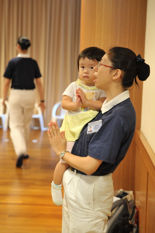 在静思堂进行浴佛队伍整合时,婉君师姊恳请音控组的许翠琴师姊充当保姆协助照顾宝宝,自己则回到供献组和大家一起练习。摄 / 王绥喜