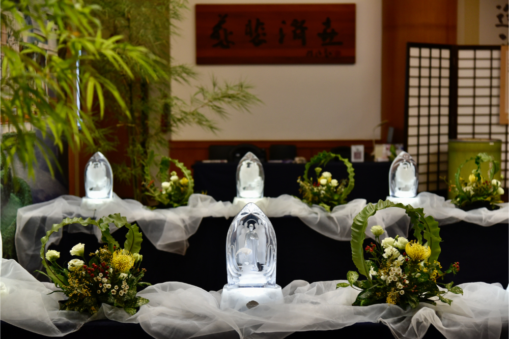 文化厅内,“宇宙大觉者”琉璃佛像安定人心,素雅的鲜花摆放高低错落,清净庄严。(摄/ 伍书永)