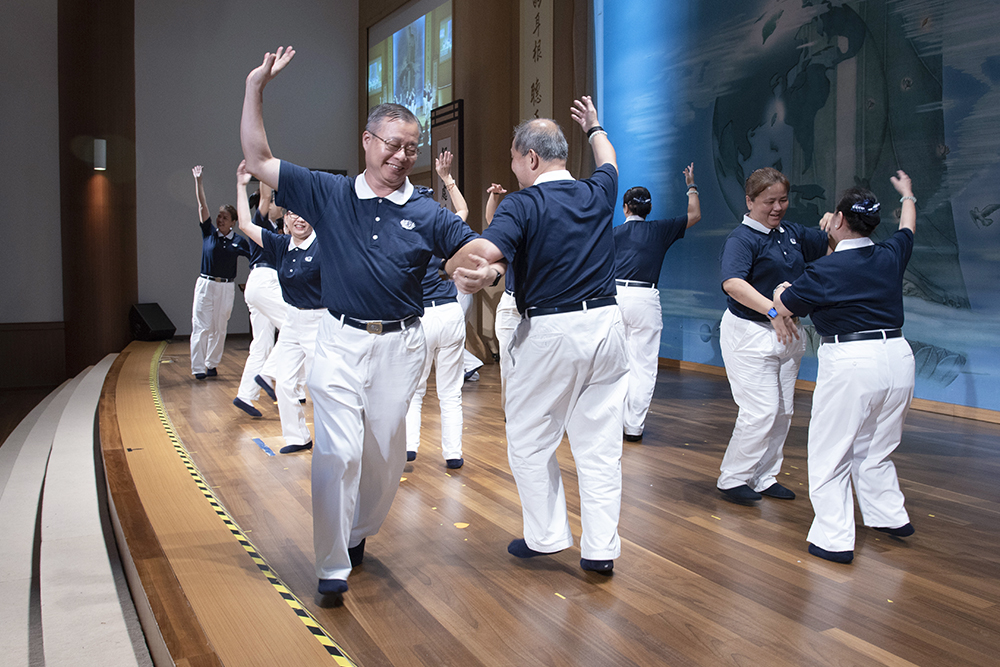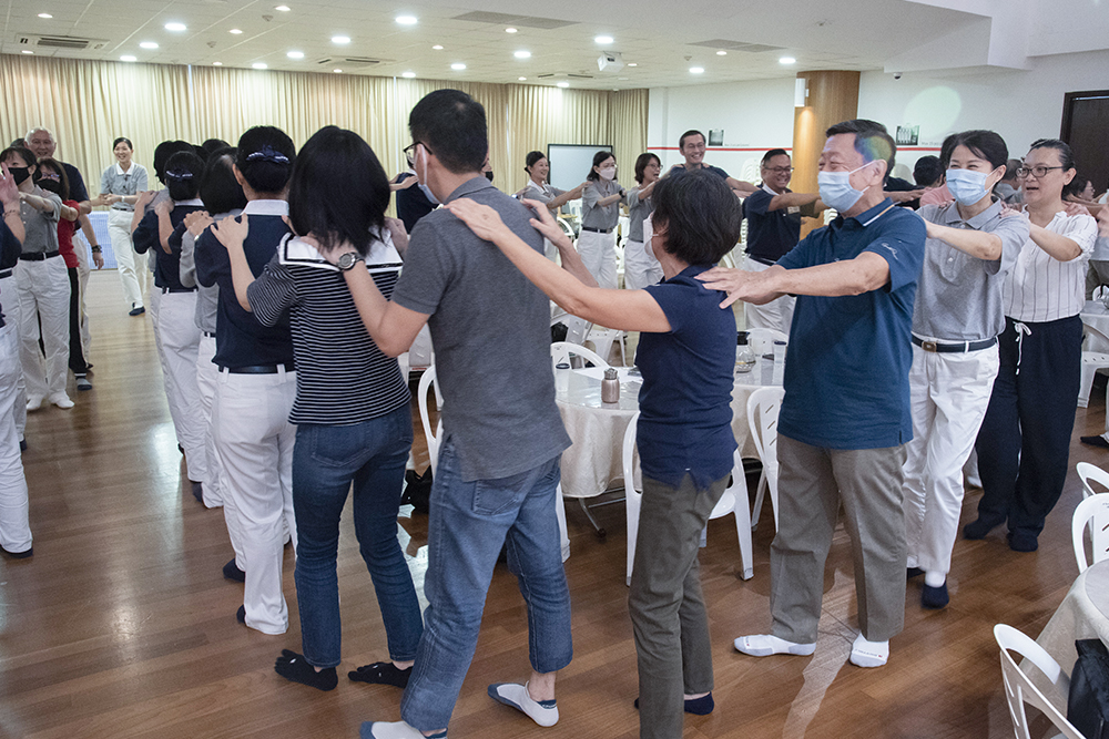 随着儿歌《当我们同在一起》旋律响起,人文茶会的破冰游戏开始了!众人搭着肩膀围成圈,每唱到特定字句,就要马上掉过头来,搭上另一为伙伴的肩膀。趣味小游戏让整个佛堂充满欢声笑语。接下来,志工演绎一曲手语团康《认识您真好》,大家跟随节奏跳起来,陌生感迅速融化,也为茶会掀开序幕。
