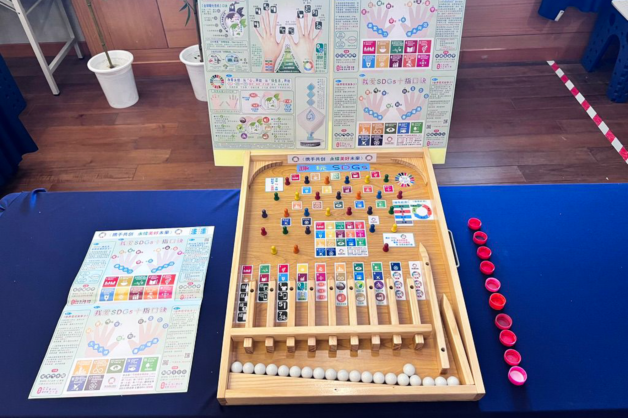 还有一个以SDGs十七项永续发展目标为主轴的游戏—— 趣玩SDGs弹珠台,学员将弹珠弹射出去,并根据弹珠落点回答相应问题;答对者即可获得一定数量的瓶盖作为奖励。